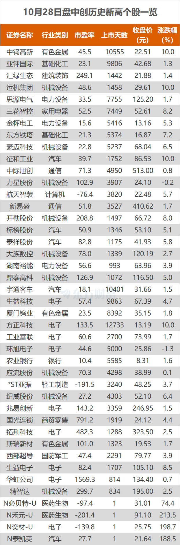 10月28日,A股三大指数今日集体小幅下跌,沪指4000点得而复失。截止收盘,沪指跌0.22%,收报3988.22点;深证成指跌0.44%,收报13430.10点;创业板指跌0.15%,收报3229.58点。东方财富Choice数据显示,今日有42只个股盘中股价创历史新高,分别为三花智控、工业富联等。