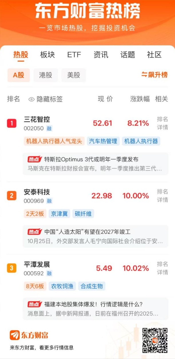 10月28日,两市冲高回落,三大指数均小幅收跌,沪指4000点得而复失。东方财富热股榜前三的股票中,三花智控位列第1,安泰科技位列第2,平潭发展位列第3。