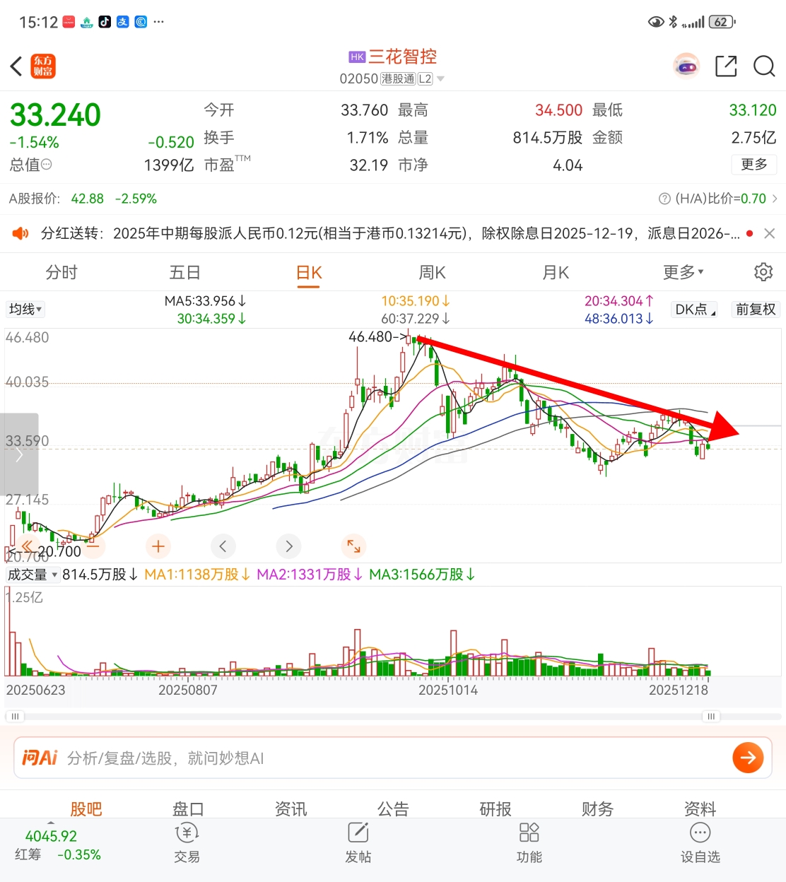 $三花智控(HK|02050)$ 下降趋势,一浪比一浪低。