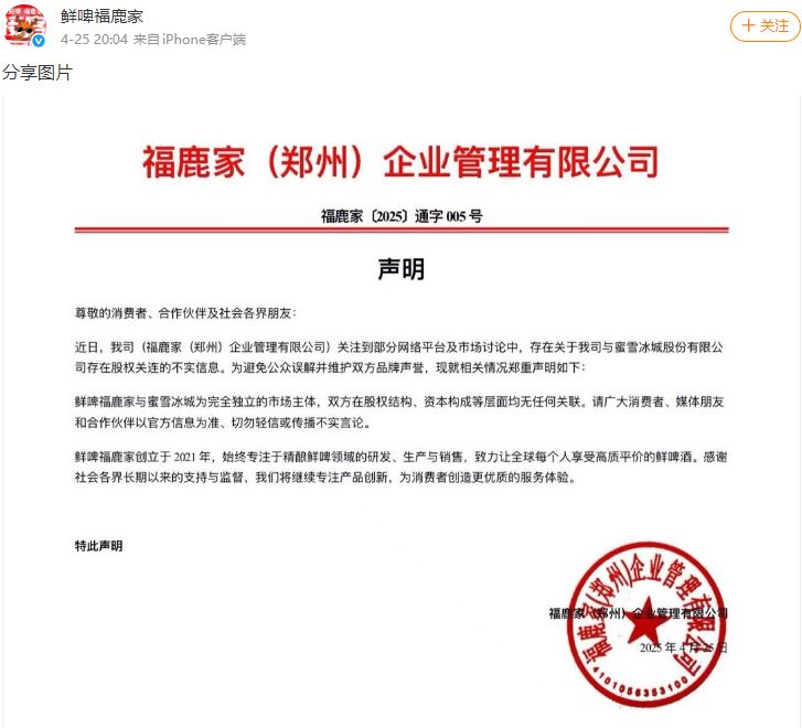 事实上,早在今年初,鲜啤福鹿家就曾多次被传闻为“蜜雪冰城子品牌”,彼时鲜啤福鹿家、蜜雪冰城都曾表示:“双方为完全独立的市场主体,在股权结构、资本构成等层面均无任何关联。”今年4月,鲜啤福鹿家还就此发布过官方声明。