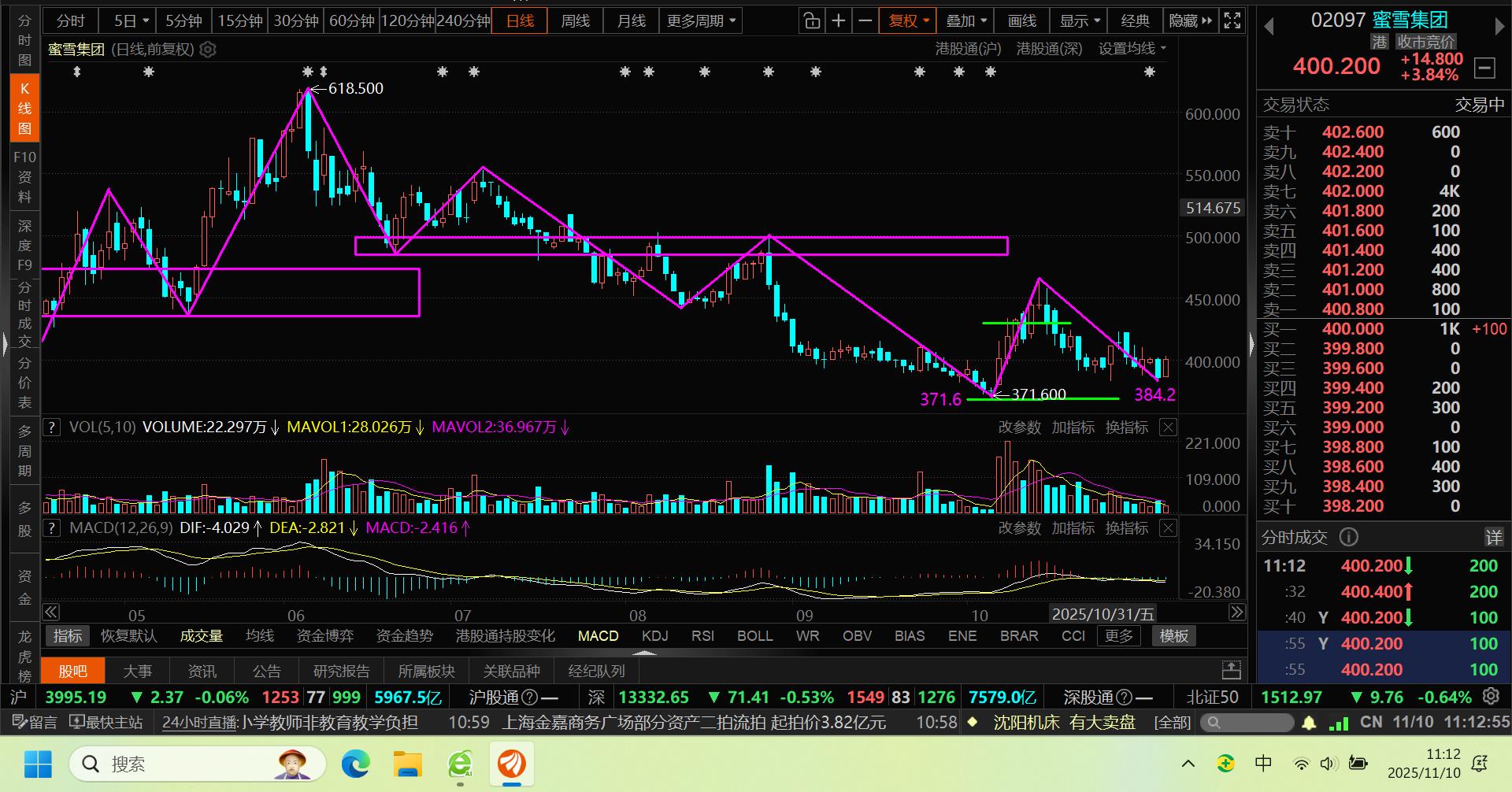 11月10,蜜雪集团见底,港股有明细炒消费的迹象,与10月CPI转正有关,炒确定性。