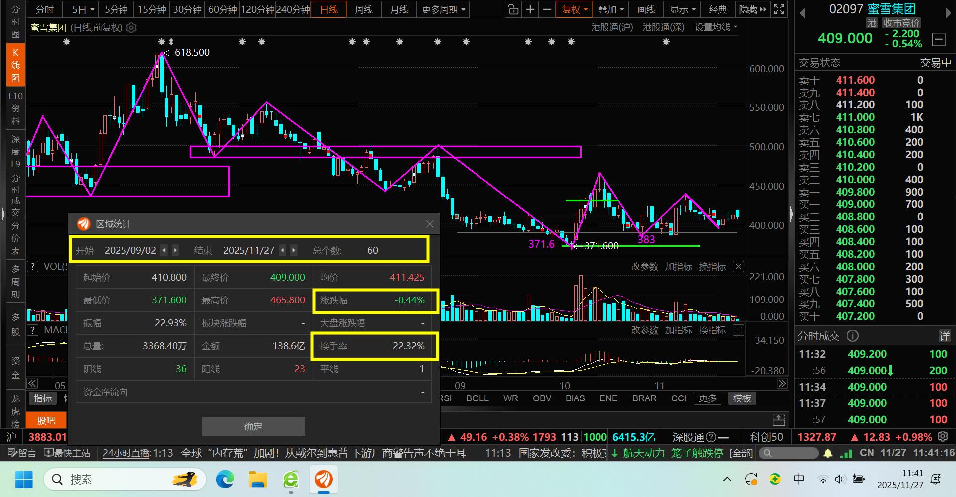 11月27日,今天港股消费整体在动,买入没人要的蜜雪集团,股价在410一线震荡60个交易日,换手率低,成交量低,价差小,胜率、赔率都高,值得一搏。