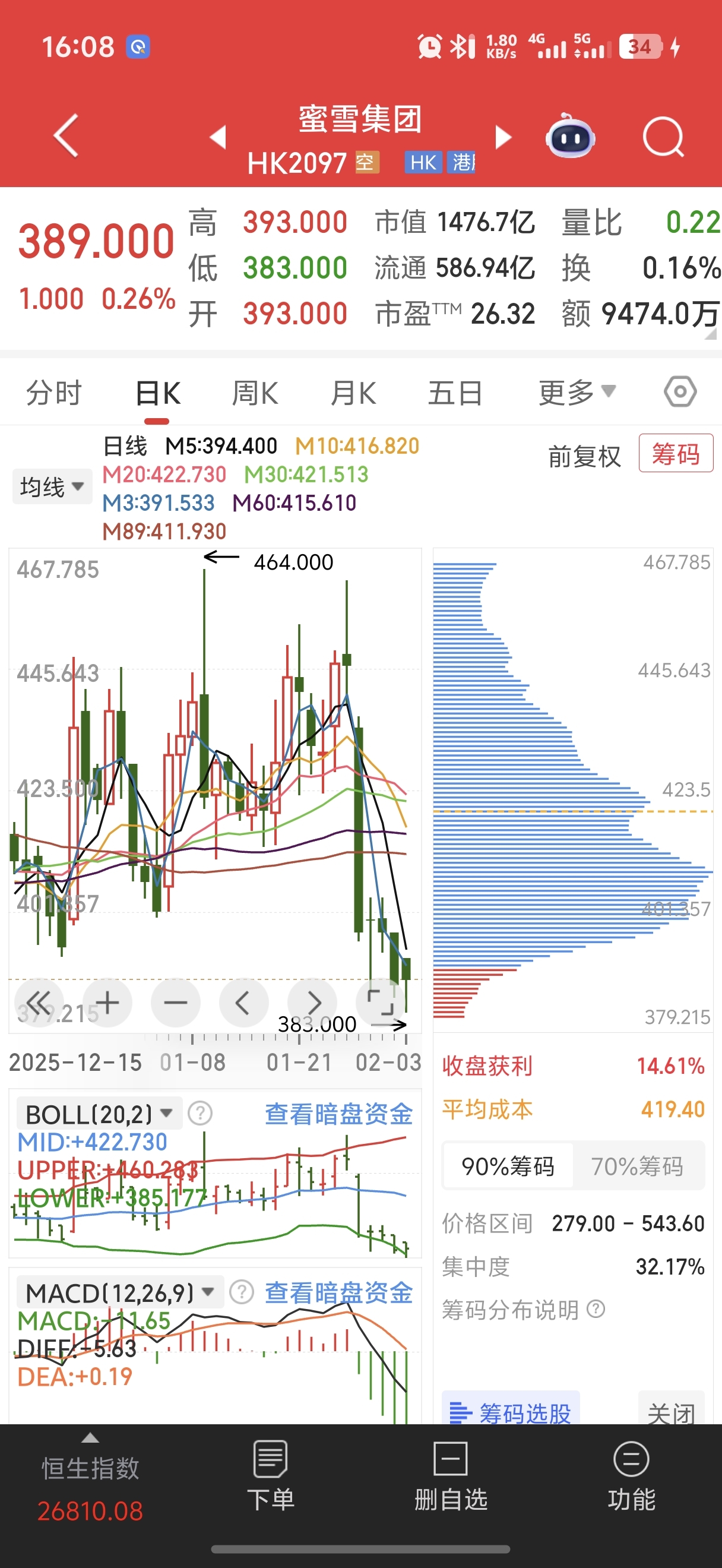 $蜜雪集团(HK|02097)$ 六根绿棒,这种boll和rsi,持续一段长时间的下跌概率极大。