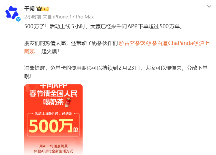 千问最新发布的内容显示“活动上线5小时,大家已经来千问APP下单超过500万单。朋友们的热情太高,还带动了奶茶伙伴们古茗茶饮、茶百道ChaPanda、沪上阿姨一起火爆!”