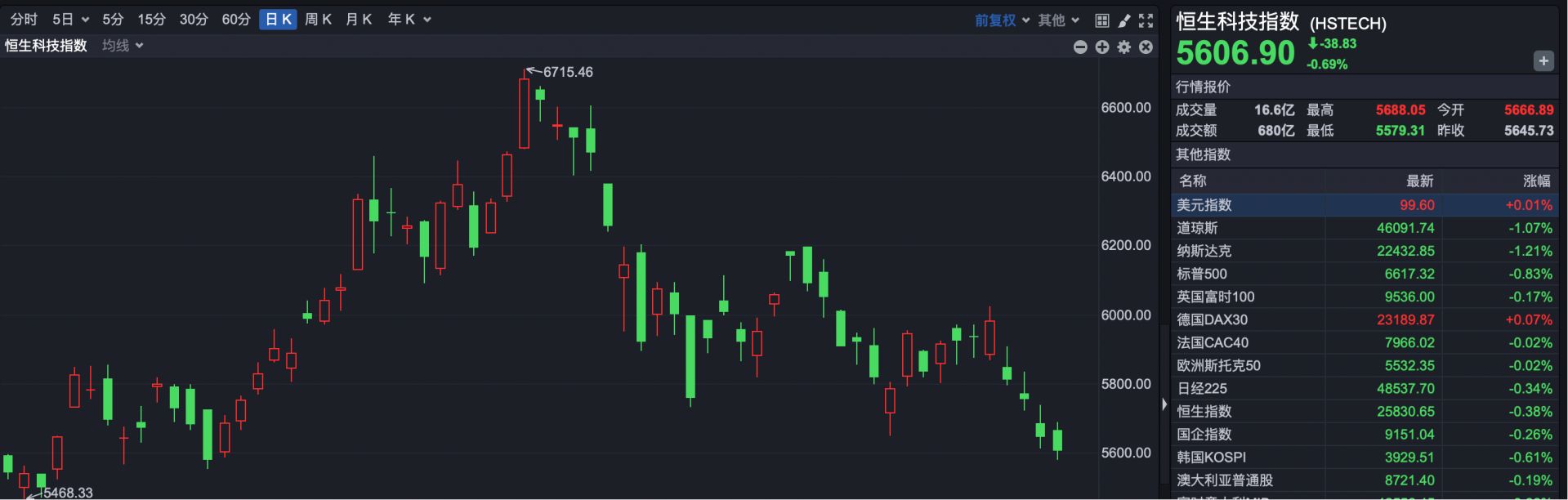 恒生科技指数报收于5606.90点,下跌38.83点,跌幅0.69%。