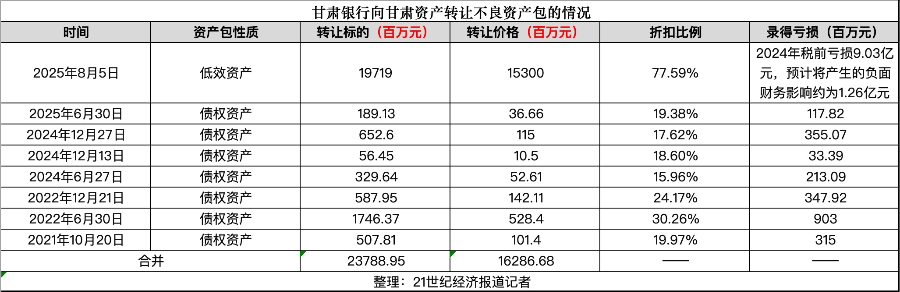 2025年8月5日,甘肃银行发布公告称,该行与甘肃资产管理有限公司签订资产转让合同,拟以153亿元的价格出售账面余额达197.19亿元的资产包。