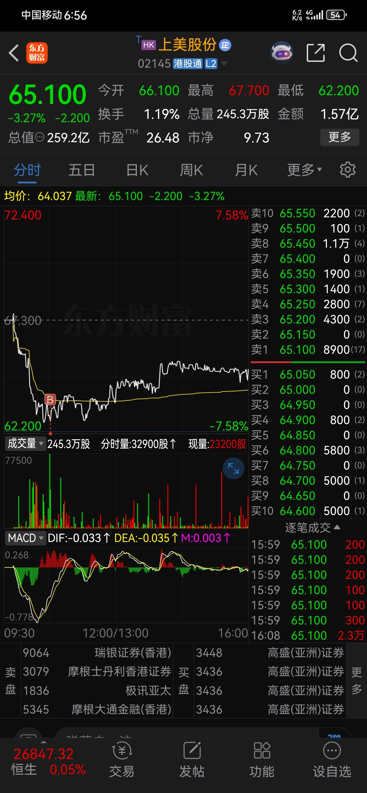 $上美股份(HK|02145)$ 62.20最低点买入微笑,这底能破吗