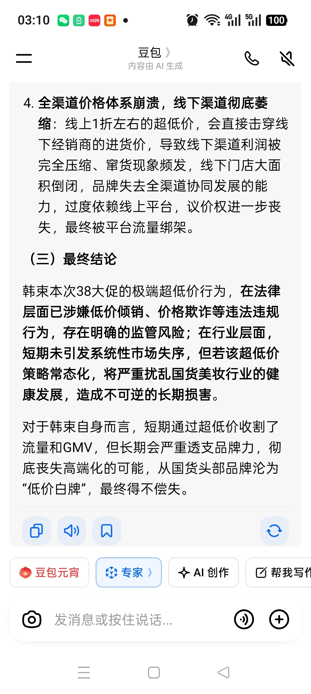 $上美股份(HK|02145)$ 最近韩束夸张的直播间数量真心震撼到我了,赶紧豆包一下他的38大促力度,以往大促力度趋势,面对推流税新规是否盈利?是否涉嫌扰乱市场。上图大家看,不是我说的啊,是豆包说的。