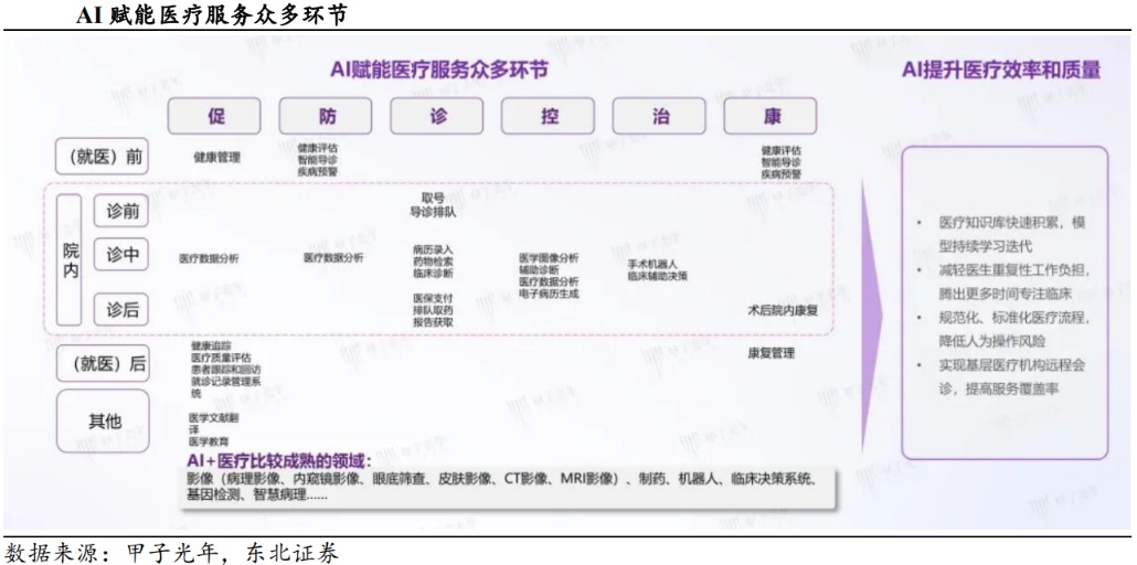 政策端的红利释放为行业注入强劲信心。2024年11月,国家卫健委明确了84个AI应用场景;2025年11月,《关于促进和规范“人工智能+医疗卫生”应用发展的实施意见》进一步设定目标:到2027年形成一批临床专科垂直大模型,到2030年推动二级以上医院普遍开展影像智能辅助诊断等应用 。AI技术有望解决医疗界“不可能三角”(即就诊快、费用低、质量高无法同时满足),通过大规模、随时随地的服务供应和缩短新药研发周期,实现医疗资源的普惠化 。