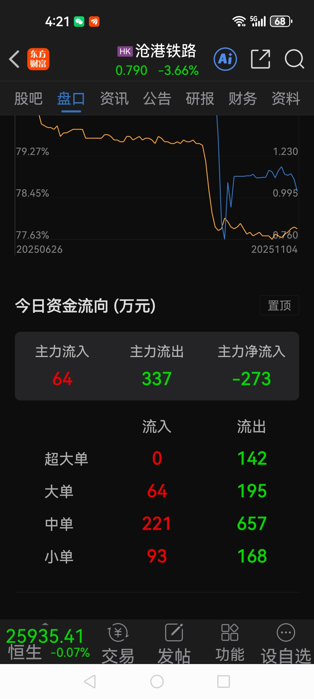 $沧港铁路(HK|02169)$ 资金持续流出,继续探底。没有大资金介入,没法涨,只靠散户瞎折腾,难呀!