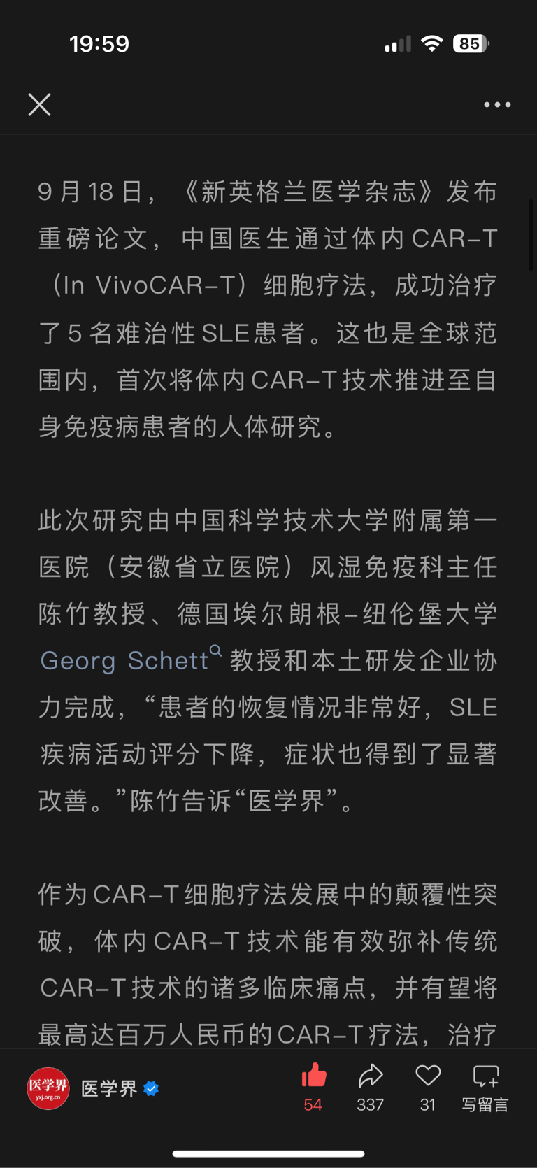 明天要起飞了,体内CAR-T成功了,以后价格可能降到10万