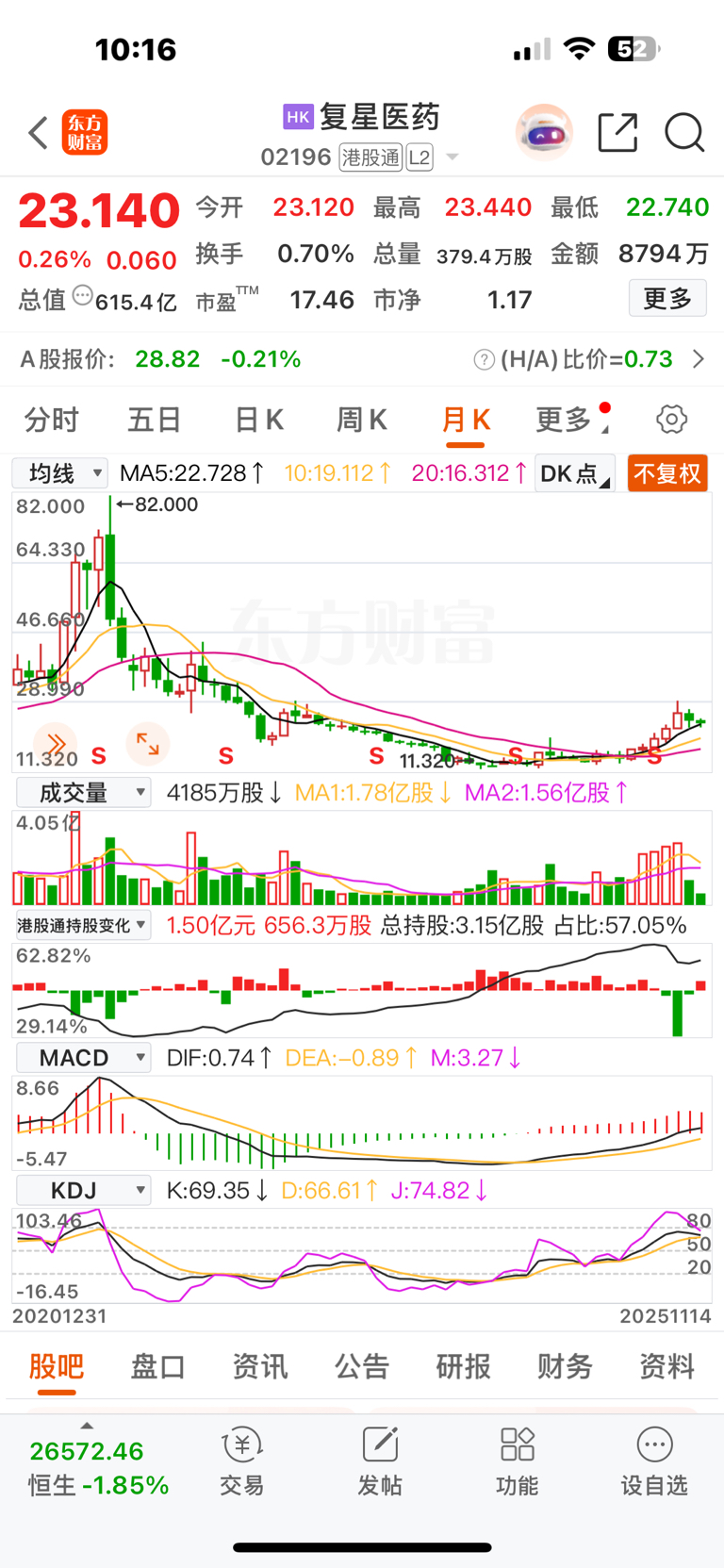 $复星医药(HK|02196)$ 月线连续5个月长涨放量,流金放量流入,近两个月下跌缩量,流金本月为下跌流入,洗盘即将结束,等待收获吧