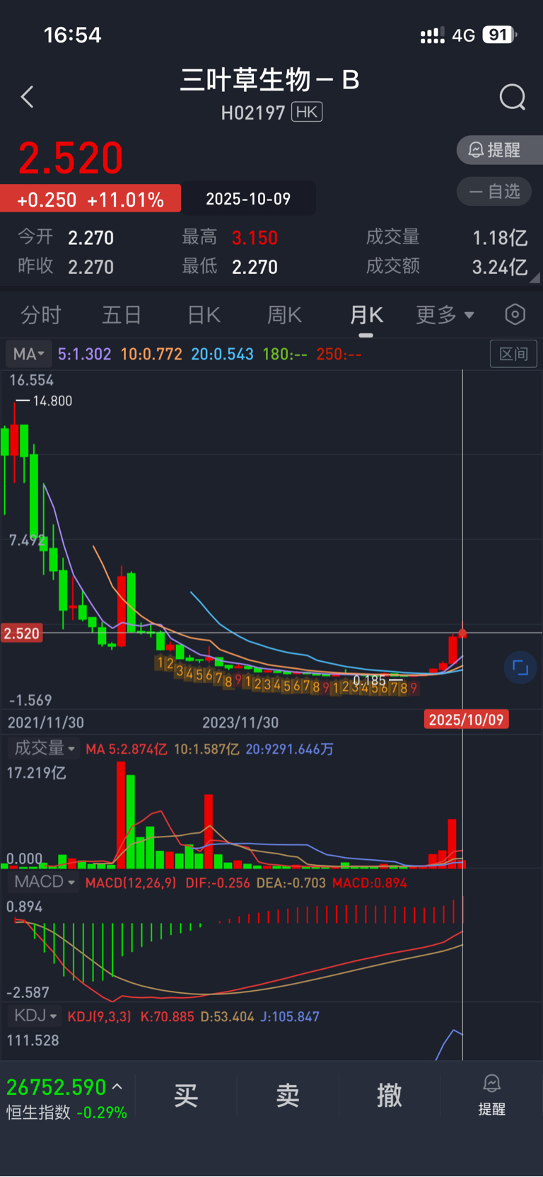 $三叶草生物-B(HK|02197)$ 本月是涨了11.01%,应该感到高兴啊!