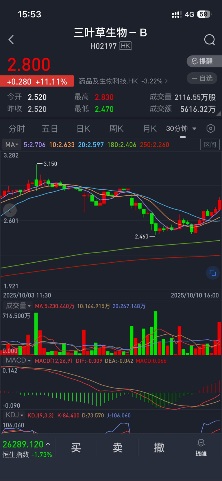 $三叶草生物-B(HK|02197)$ 15:30(30分钟线)以后,放量上涨。厉害。持股待涨!必须赚大钱再走。