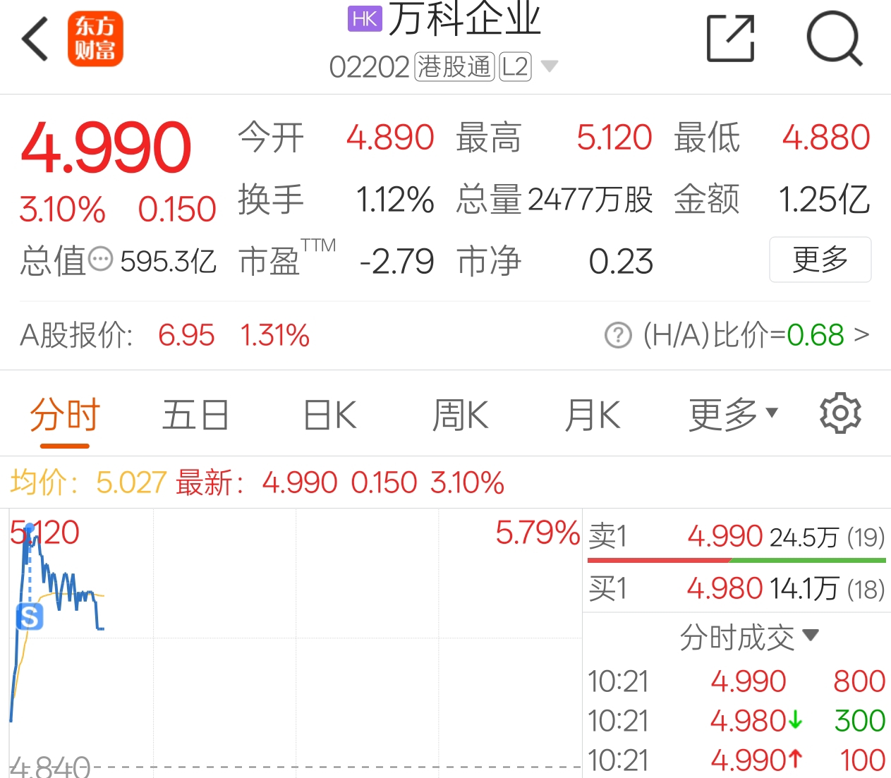 $万科企业(HK|02202)$ 跟随主力高抛低吸,今天5.1算高点了吧,减