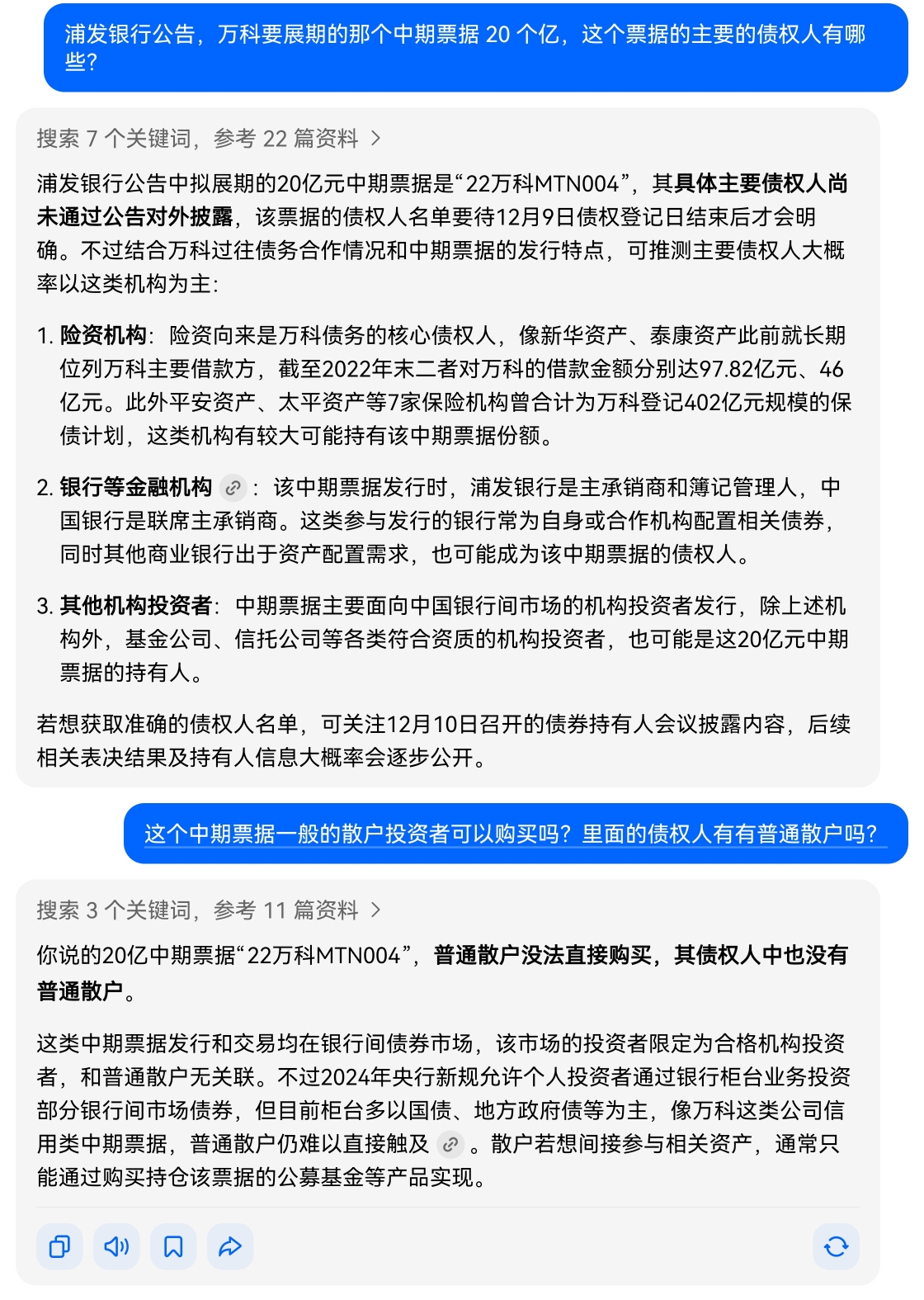 你说的20亿中期票据“22万科MTN004”,普通散户没法直接购买,其债权人中也没有普通散户。