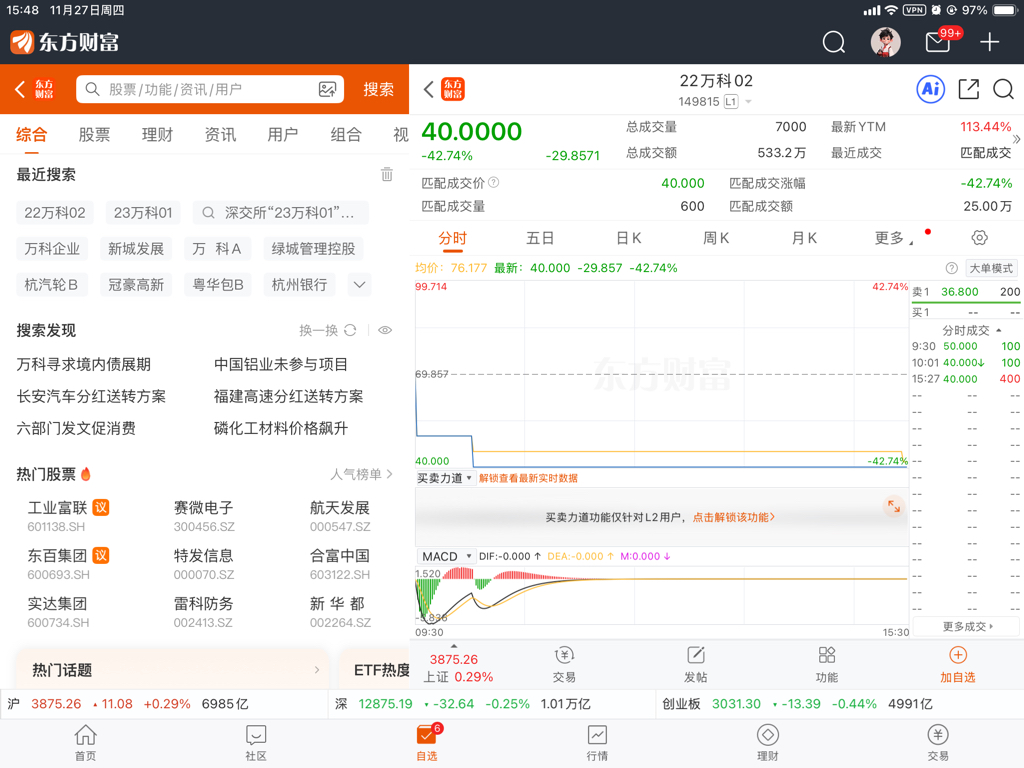 15:27恢复交易:大跌42.74%买盘也1股都没
