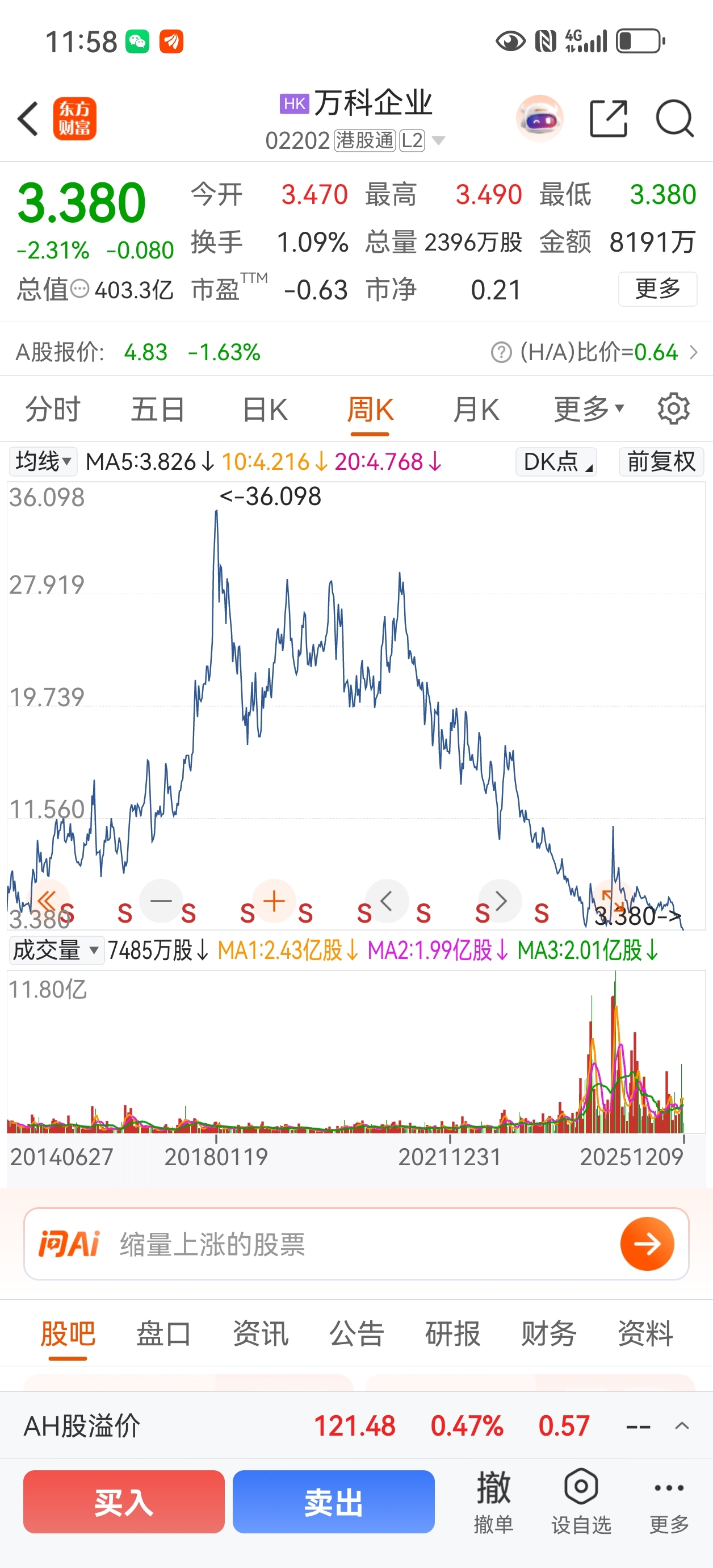 $万科企业(HK|02202)$ 万科股价跌到了2014年低点。。。