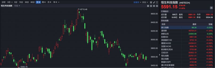 恒生科技指数报5591.15点,上涨56.56点,涨幅1.02%。