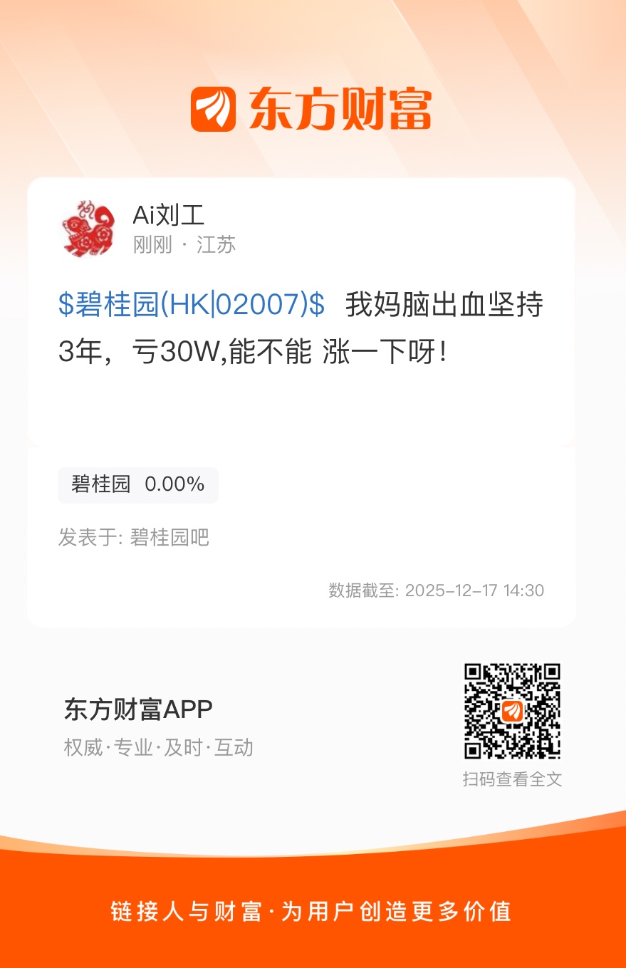 $碧桂园(HK|02007)$  我妈脑出血坚持3年,亏30W,能不能 涨一下呀!