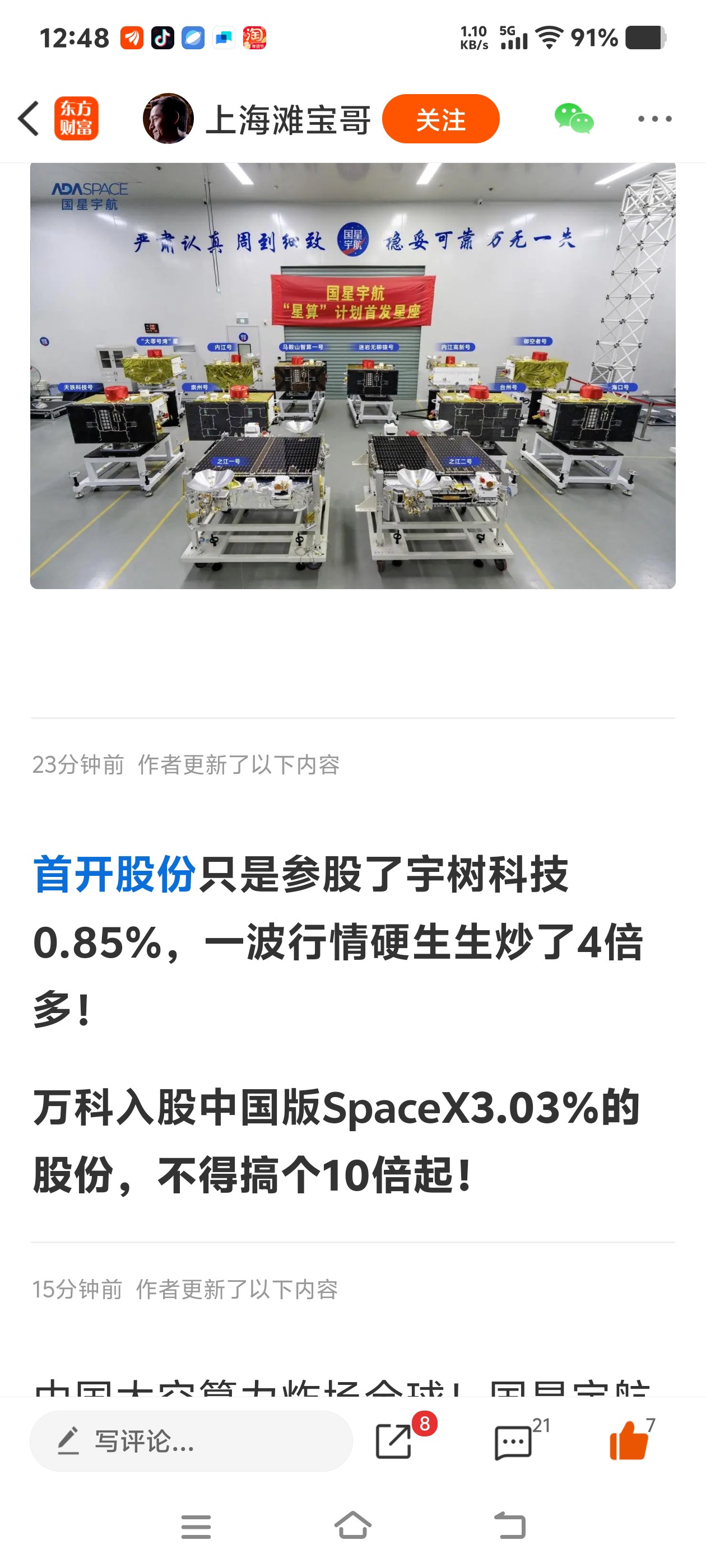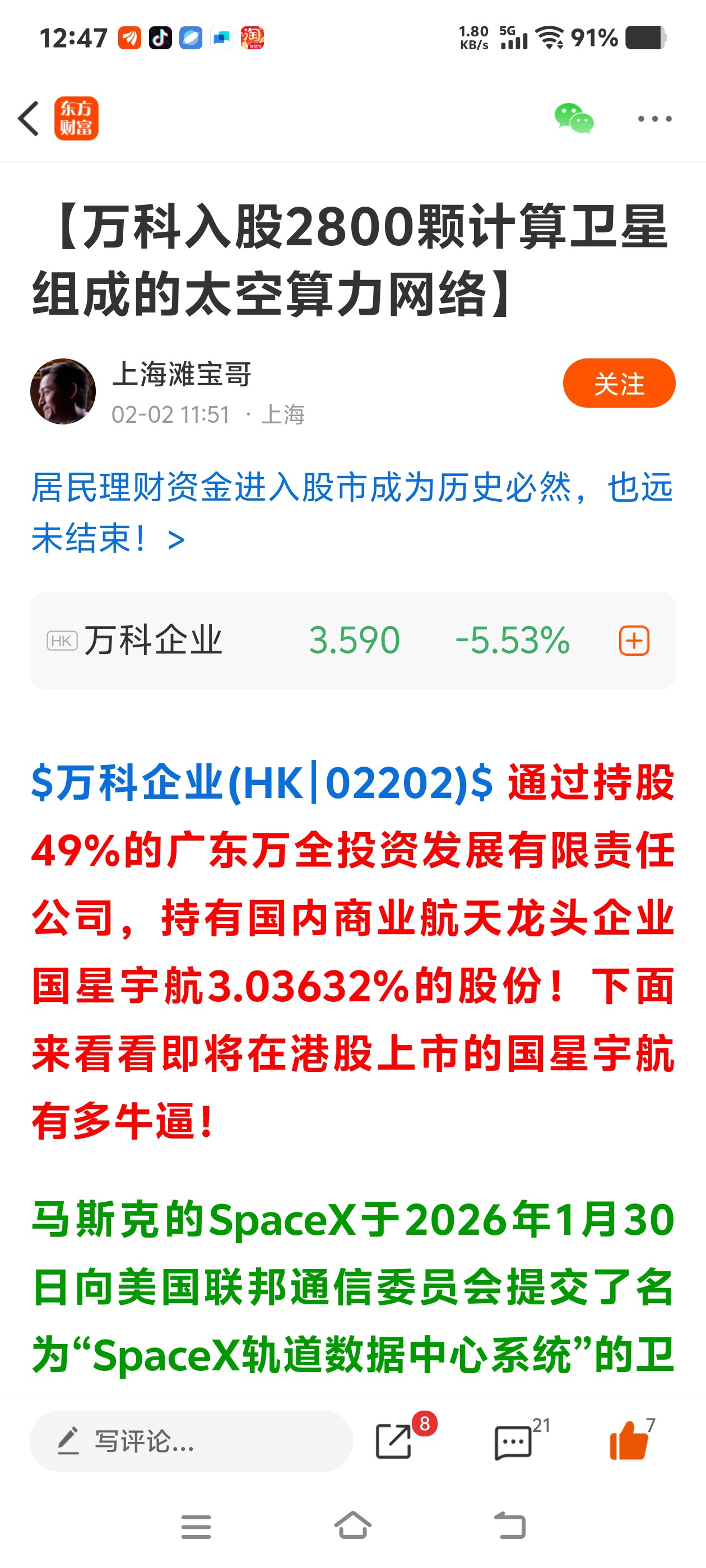 $万 科A(SZ000002)$主力已经发文了,万科已经入股3%搞卫星,今天下午涨停板都有可能的$万科企业(HK|02202)$自己来看,主力已经发贴
