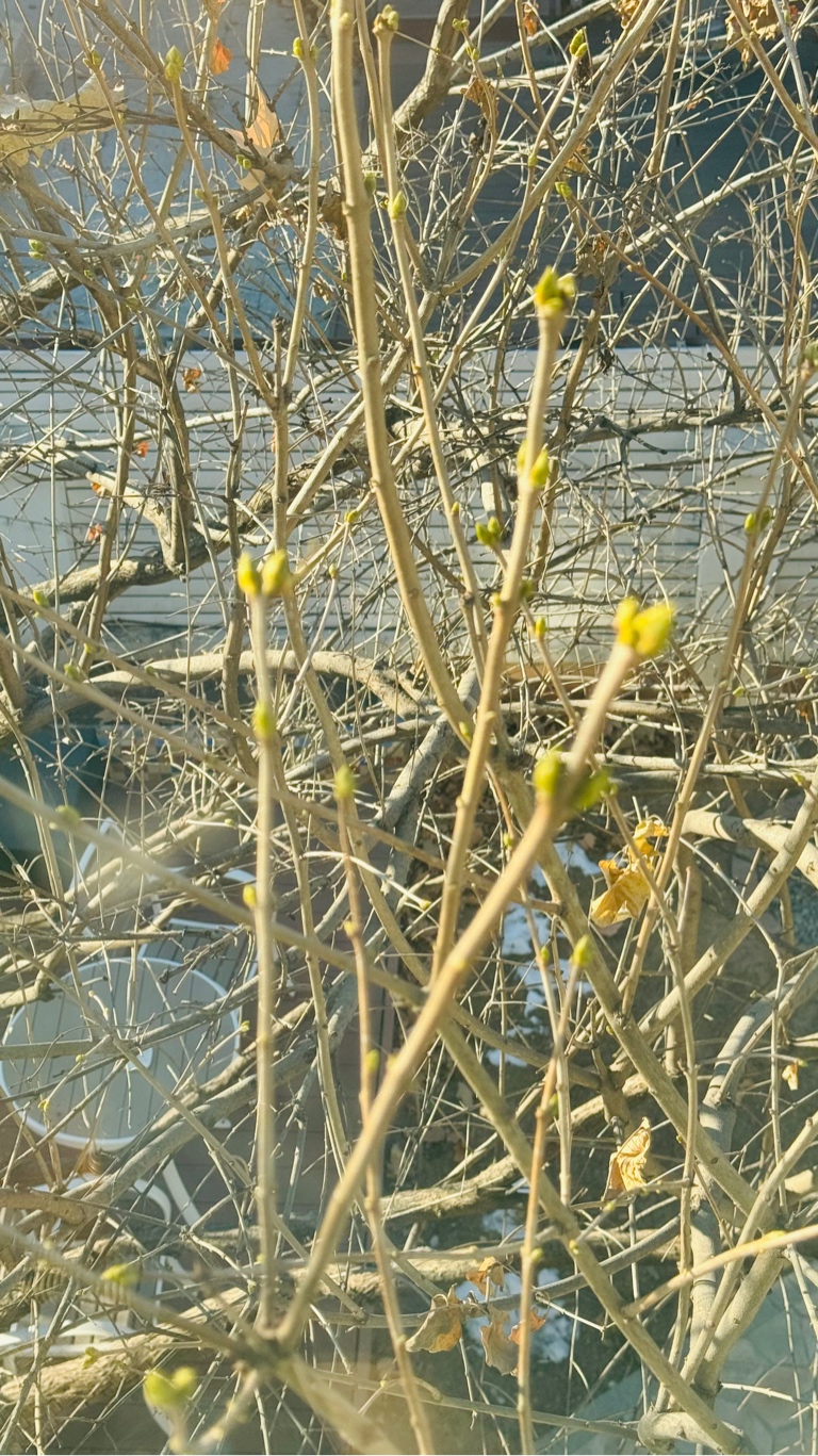 寒冬时节院子里的丁香花枝头嫩芽吐新