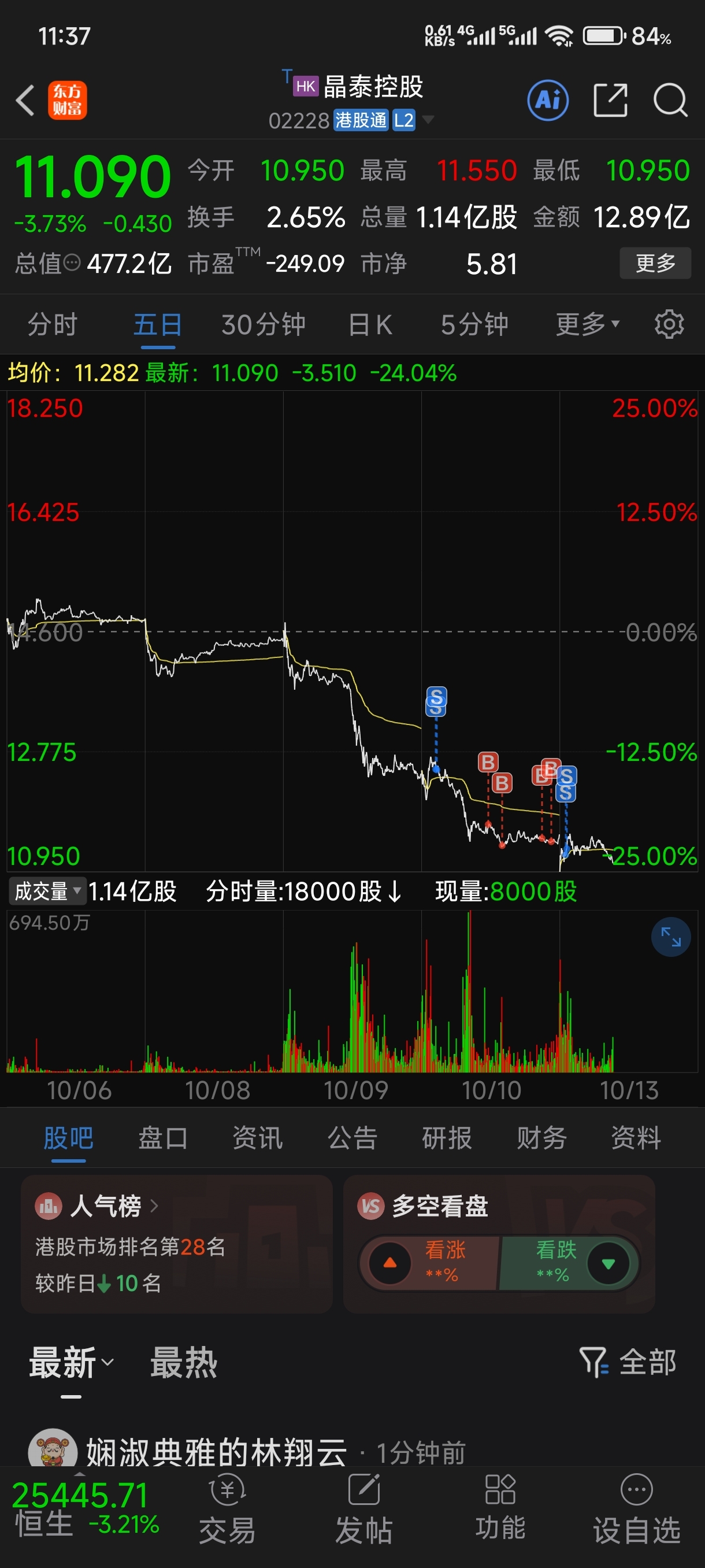 $晶泰控股(HK|02228)$ 本来周五做了7个点的差价,谁曾想金毛作妖又搞走了我2个点!奶奶个熊,小黄毛一天不作它就浑身难受