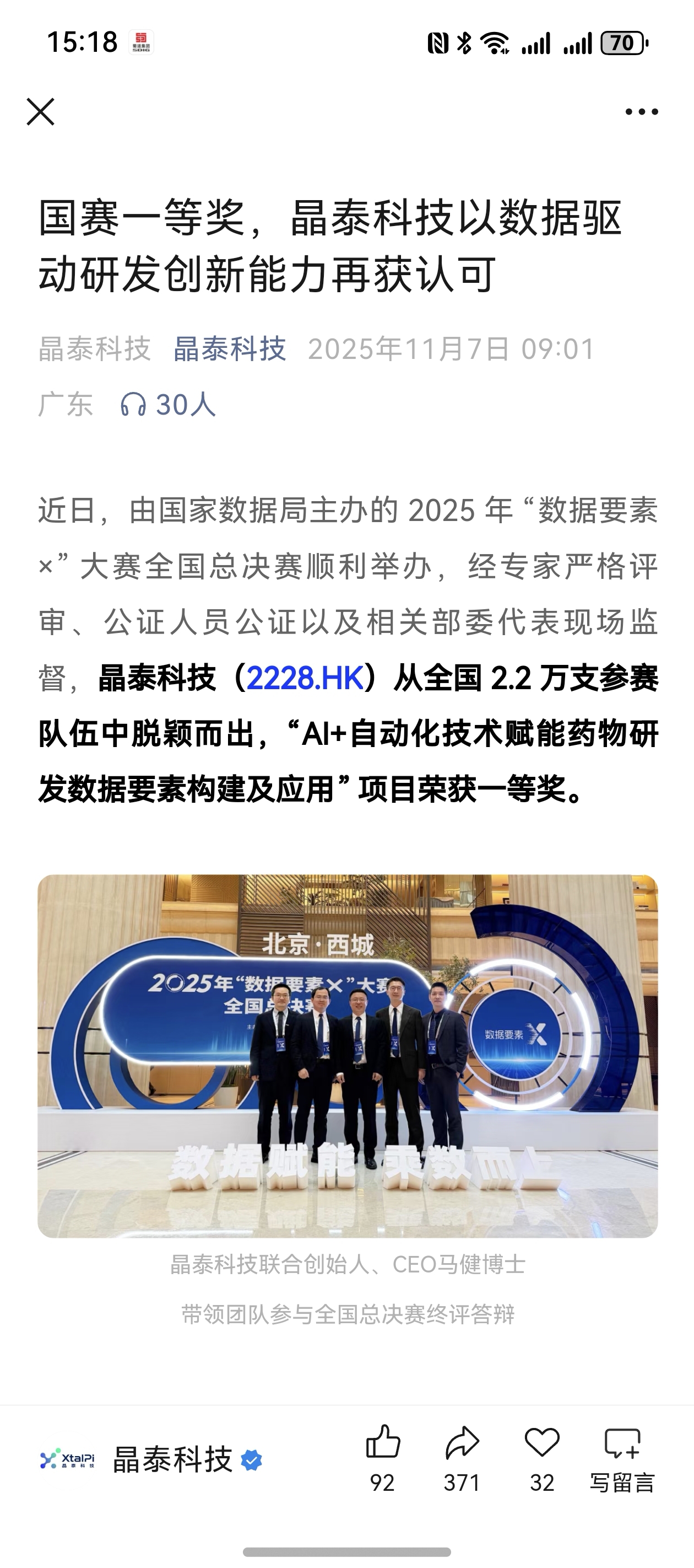 $晶泰控股(HK|02228)$ 长期持有,静待花开。这样的公司不知有什么担心的。国赛数据集大赛2万家参赛,晶泰都能获一等奖。牛批