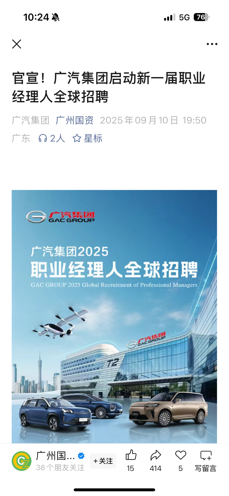 广汽集团招聘公告已过一个月多,高层亟需新鲜血液注入