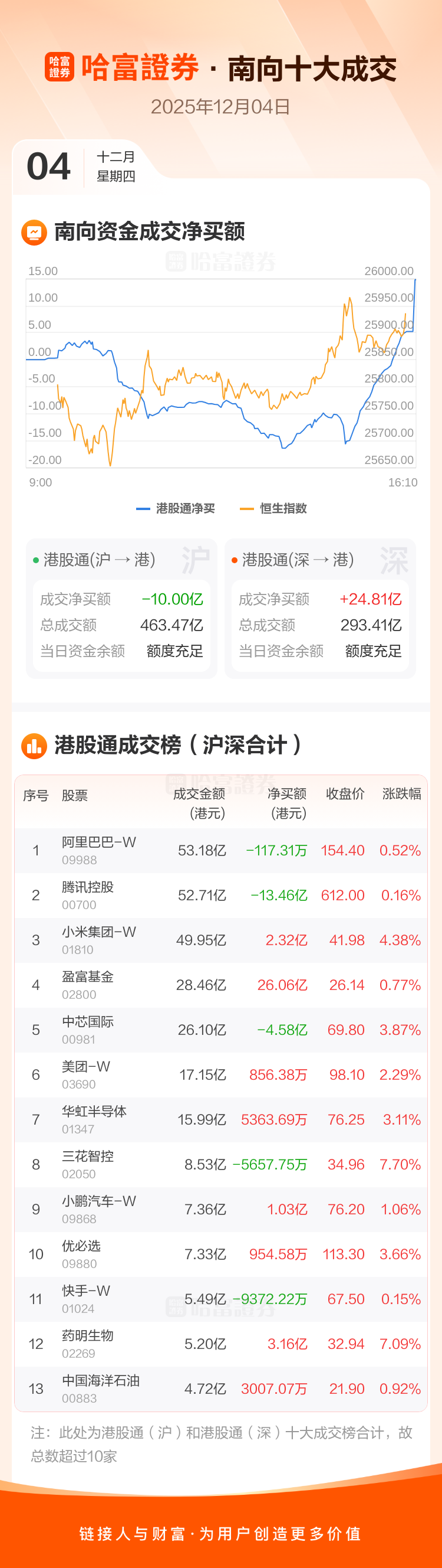 恒生指数12月4日涨0.68%,收报25935.9点。南向资金今日净买入港股14.80亿港元。南向资金今日成交额756.88亿港元,港股大市成交1793.06亿港元。