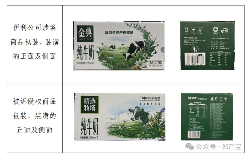此外,基于对伊利“金典”与蒙牛“精选牧场”两者包装、装潢存在的差异,尚不足以导致整体视觉效果产生明显区别;蒙牛侵权商品使用近似的包装、装潢,容易造成消费者混淆、误认等判断,法院裁定被诉行为构成擅自使用他人有一定影响商品包装、装潢的不正当竞争行为。