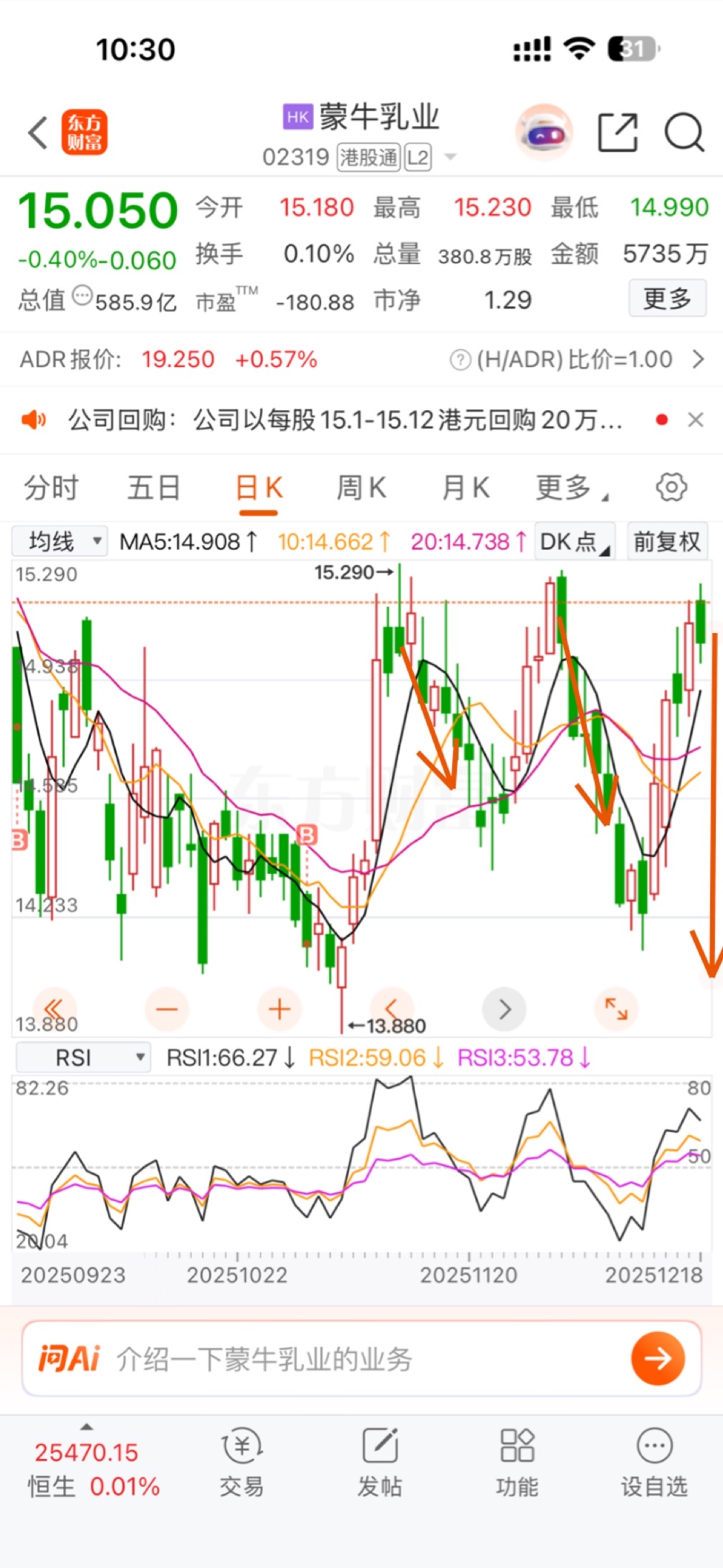 $蒙牛乳业(HK|02319)$ 所以15以上要卖,14一下要买