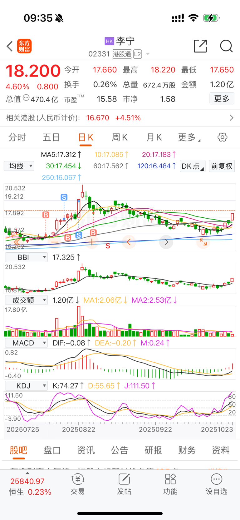 $李宁(HK|02331)$ 差3毛钱就解套了...这波小亏就是赚,放平心态,左边的压力位还是挺大的。
