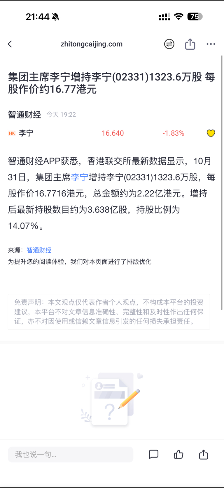 $李宁(HK|02331)$ 老李子还没吃够筹码啊。难怪股价一直上不去,人家还要吃货啊,可怜我了浮亏7个点在宁子躲牛市