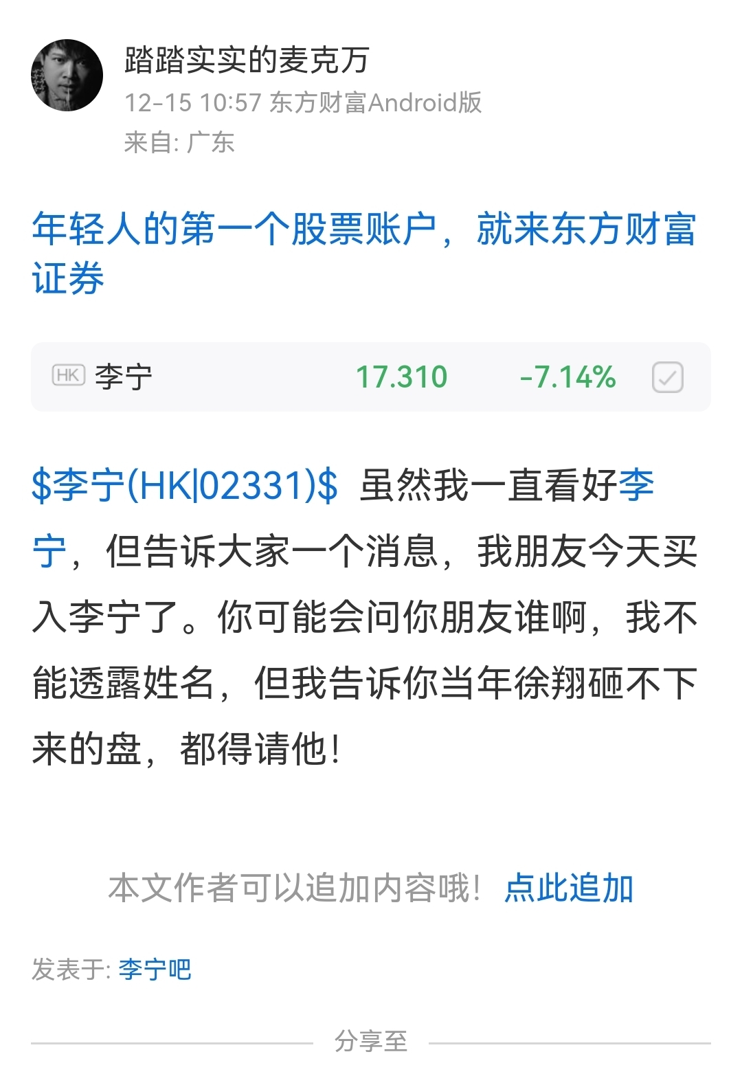 温馨提示: 1.根据《证券法》规定,禁止编造、传播虚假信息或者误导性信息,扰乱证券市场;2.用户在本社区发表的所有资料、言论等仅代表个人观点,与本网站立场无关,不对您构成任何投资建议。用户应基于自己的独立判断,自行决定证券投资并承担相应风险。《东方财富社区管理规定》