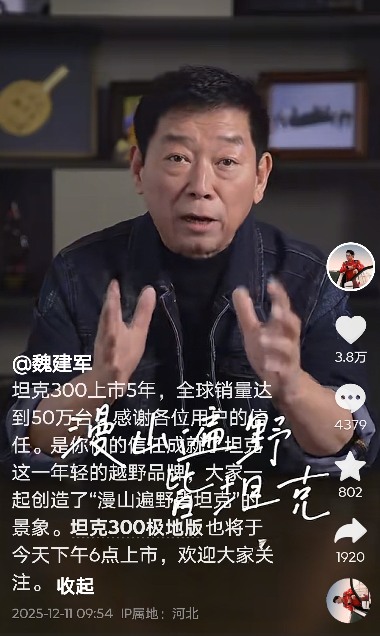 魏建军的官方账号发布,“坦克300上市5年,全球销量达到50万台,感谢各位用户的信任。是你们的信任成就了坦克这一年轻的越野品牌,大家一起创造了“漫山遍野皆坦克”的景象。坦克300极地版也将于今天下午6点上市,欢迎大家关注。”