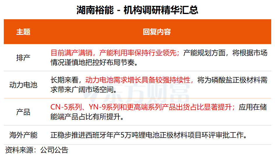 “受益于下游动力电池和储能电池旺盛的需求,公司目前满产满销,产能利用率保持行业领先。”湖南裕能称,在产能规划方面,公司将根据市场情况谨慎地把控好布局节奏。