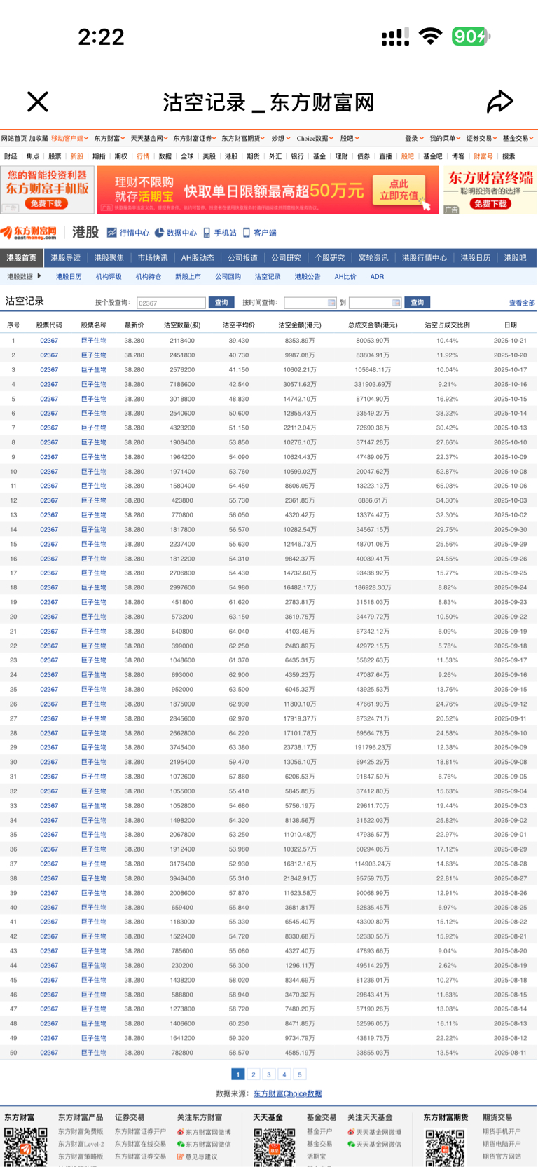 $巨子生物(HK|02367)$ 根据东方财富网的数据,截至2025年10月21日,巨子生物的沽空数量为211.84万股,沽空平均价为39.43港元,沽空金额为8353.89万港元,总成交金额为8.01亿港元,沽空占成交比例为10.44%