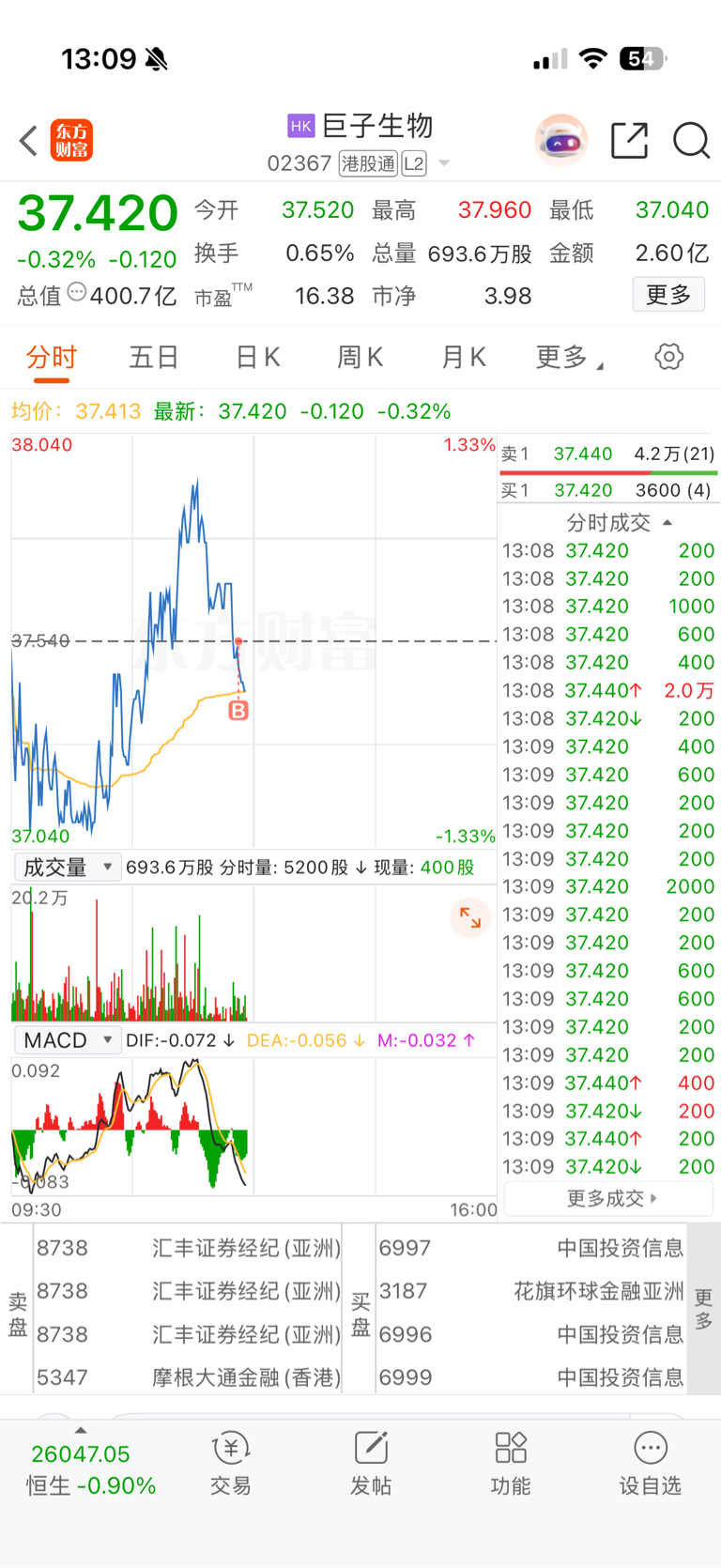 $巨子生物(HK|02367)$ 想着抬一下,买完立刻有六万股压下来,感觉安全被控了