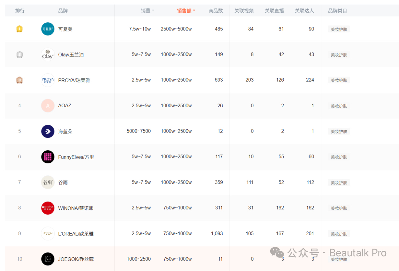 2025年10月27日抖音美妆护肤品牌销售排行榜TOP10可复美销量第一