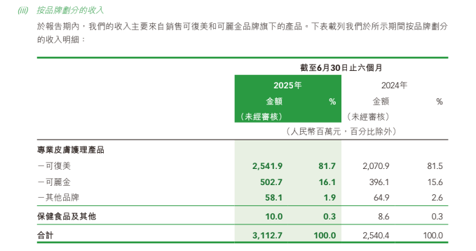 尽管公司试图孵化“可丽金”等子品牌,但2025年上半年“可复美”依然贡献了高达25.4亿元的收入,营收占比进一步攀升至81.7%。这种对单一品牌、单一成分(重组胶原蛋白)的高度依赖,使得公司在面对舆论危机或技术迭代时缺乏足够的缓冲。