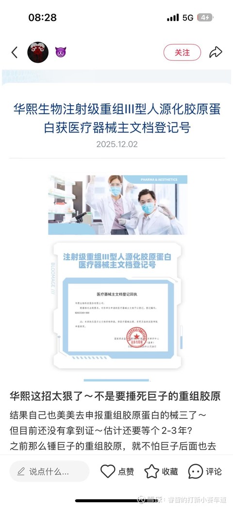 6月份华熙生物老大燕子发长文认为重组胶原蛋白不会割了她家透明质酸的命,现在为什么