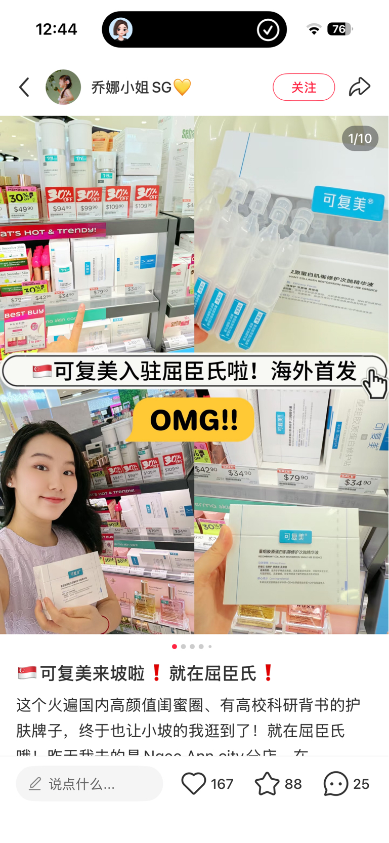 巨子生物在东南亚马来越南菲律宾泰国新加坡线下屈臣氏kkv等均已上货日本韩国欧洲美