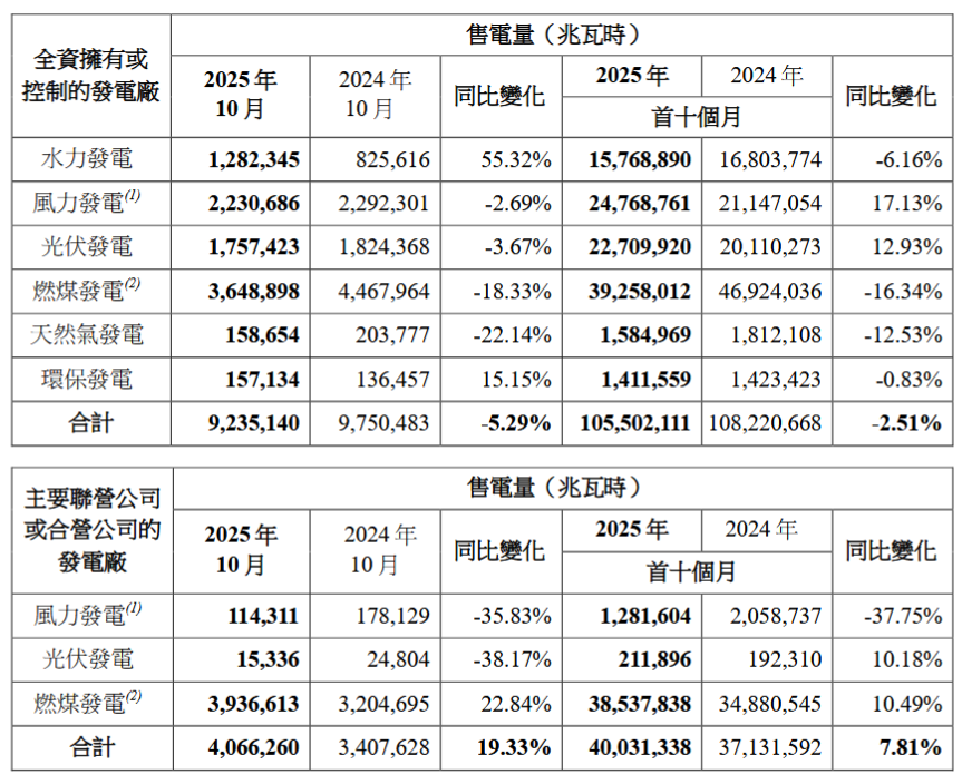 中国电力10月合并总售电量924万兆瓦时,同比减少5.29%