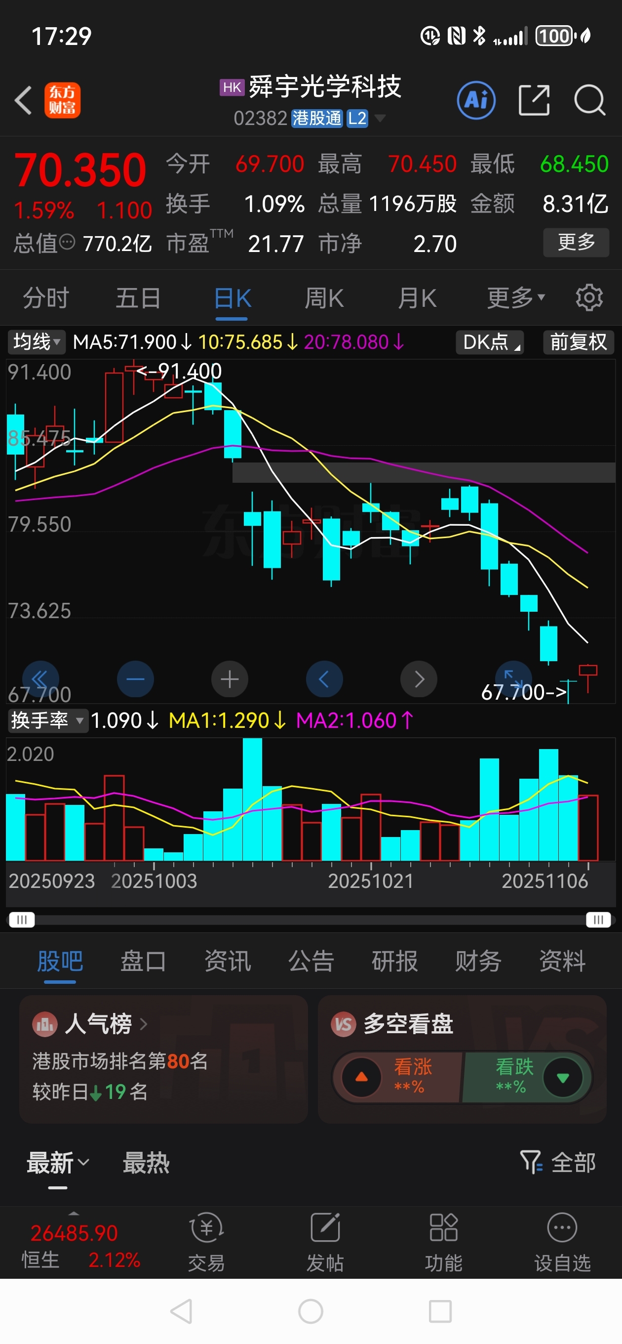 $舜宇光学科技(HK|02382)$ 嘿今天舜宇光科科技终于红啦,这太难了吧,已经连续跌了6天了。
