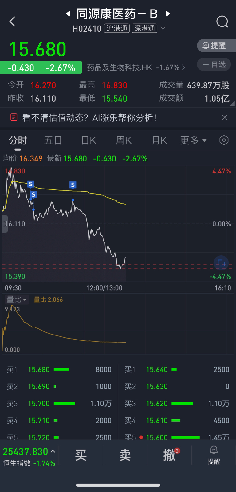 $同源康医药-B(HK|02410)$ 嫌它涨的费劲,卖了。卖对了。接回来有0.8差价不争气