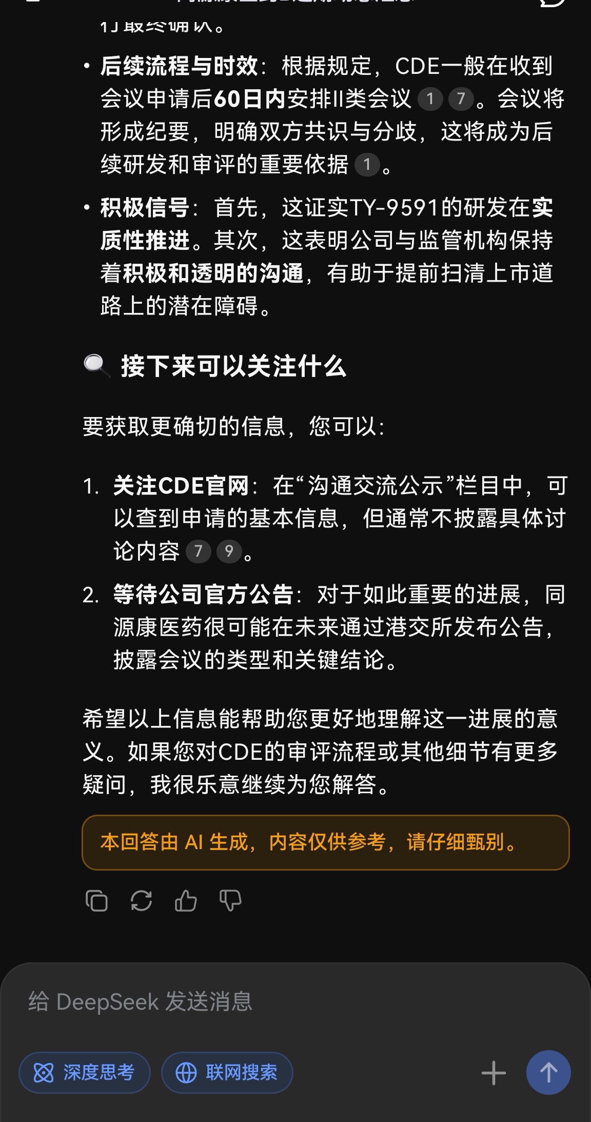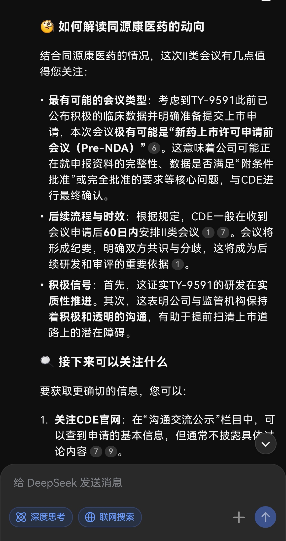 deepseek关于会议消息的分析:CDE官网昨天公示同源康医药已经提交沟通交流