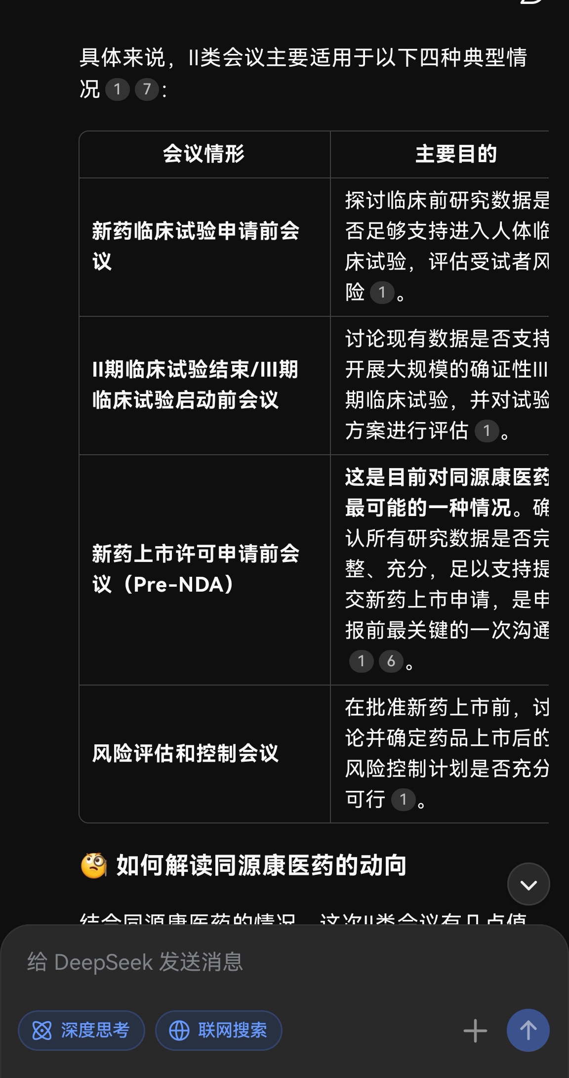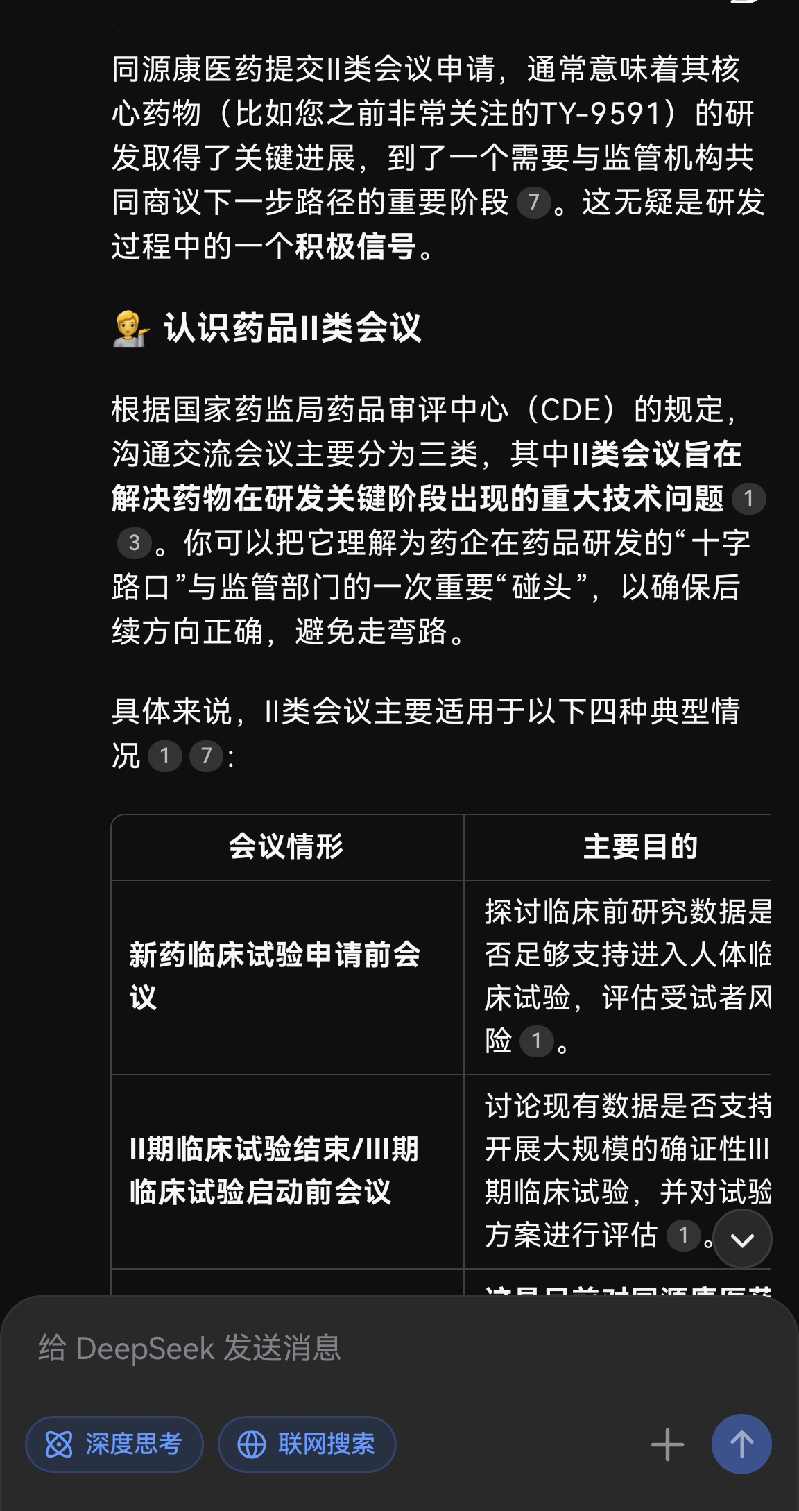deepseek关于会议消息的分析:CDE官网昨天公示同源康医药已经提交沟通交流会议申请,确定为Ⅱ类会议,这代表什么意思?