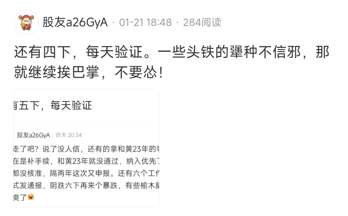 温馨提示: 1.根据《证券法》规定,禁止编造、传播虚假信息或者误导性信息,扰乱证券市场;2.用户在本社区发表的所有资料、言论等仅代表个人观点,与本网站立场无关,不对您构成任何投资建议。用户应基于自己的独立判断,自行决定证券投资并承担相应风险。《东方财富社区管理规定》