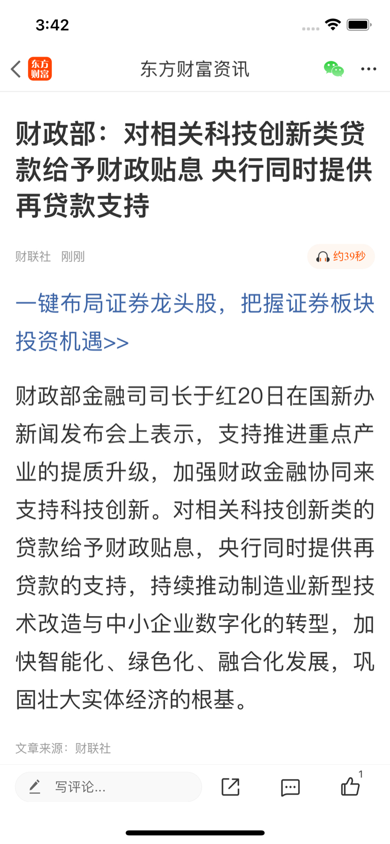 财政部金融司司长于红20日在国新办新闻发布会上表示,支持推进重点产业的提质升级,加强财政金融协同来支持科技创新。对相关科技创新类的贷款给予财政贴息,央行同时提供再贷款的支持,持续推动制造业新型技术改造与中小企业数字化的转型,加快智能化、绿色化、融合化发展,巩固壮大实体经济的根基。